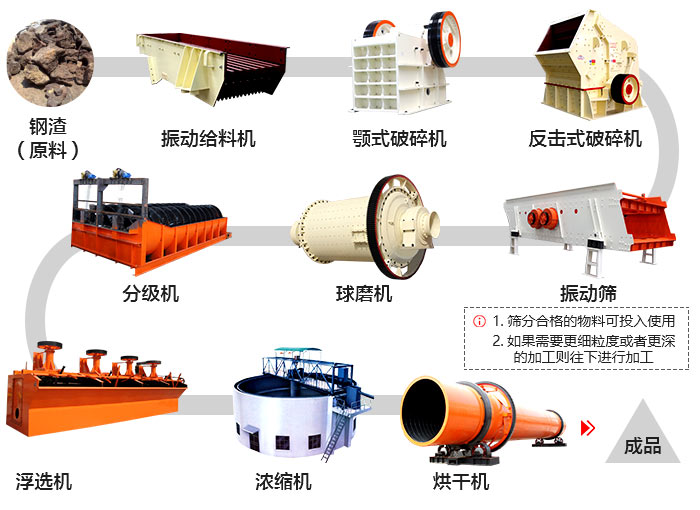 在振動(dòng)給料機(jī)的作用下,將堆積的鋼渣均勻、連續(xù)的送到顎式破碎機(jī)進(jìn)行粗碎加工,粗碎后的鋼渣通過振動(dòng)篩,合格的進(jìn)入反擊式破碎機(jī)或圓錐破碎機(jī)進(jìn)行中、細(xì)碎加工,不合格的返回上層繼續(xù)破碎,相同的經(jīng)反擊式破碎機(jī)或圓錐破碎機(jī)破碎后的鋼渣合格的通過輸送機(jī)輸出,即為成品,不合格的返回繼續(xù)破碎加工。